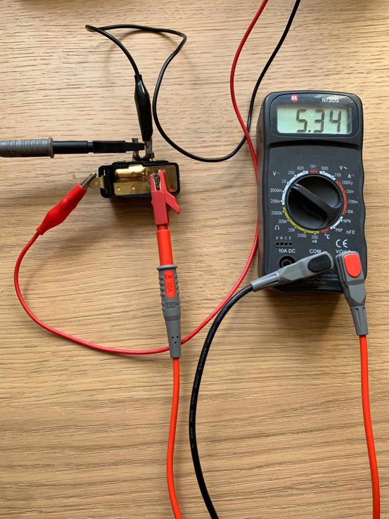 - On the Output of the device you should have around 5-6 Volts continuously. I had a really erratic reading here, literally all over the place. In the end I placed an analogue meter on this and the needle was going back and forth between 0-7 Volts. This unit was certainly faulty. Another one ordered from JK and tested on the bench and a consistent 5.3 Volts – as per photo below.